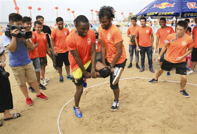 现场发令枪响起,迷你马拉松赛正式开始。看,里面居然还有一群黑皮肤、棕皮肤的外国友人,“我们一共有34人,主要来自亚非国家,都是在长沙读书的留学生。”领头的苏米克来自孟加拉国,在湖南大学读博士的他在网络上看到了关于帐篷节的信息,立马联系朋友和同学一起来参加。“在这里跑步很开心,我们非常享受这里的环境。”苏米克笑着说。这边在跑,那边拔河比赛声势震天,郴州、娄底、岳阳、怀化等城市派来了代表队,谁都不服输。人气最旺的要数角斗士精英赛了,这种被孩子们称之为“斗鸡”的运动让这些成年人乐此不疲,纷纷捉对厮杀,重温童年。夏天的沙滩上,欢乐将持续蔓延到8月9日中午。