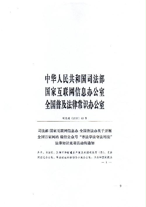 根据省新广局政策法规处、总局普法办要求,现将全国普法办《关于开展全国百家网站 微信公众号“法学法守法用法”法律知识竞赛活动的通知》转发你们,望认真组织,积极参加。于12月10日前将此次活动情况反馈到市文体广新局法制科。