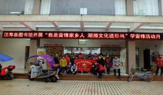 汉寿县在学雷锋月活动期间,县图书馆依托文化信息资源共享工程,招募文化志愿者协助图书馆公共电子阅览室的技术指导、政策宣传、群众上网辅导等工作,为群众广泛参与阅读提供了方便。县文化馆积极招募具有文艺才能、热心文化事业的文化志愿者,组织举办“庆三八暨我是雷锋家乡人 湖湘文化送春风学雷锋活动月广场文艺演出”活动,活动现场座无虚席,营造了良好的学习雷锋精神的氛围,进一步丰富了当地群众的精神文化需求。