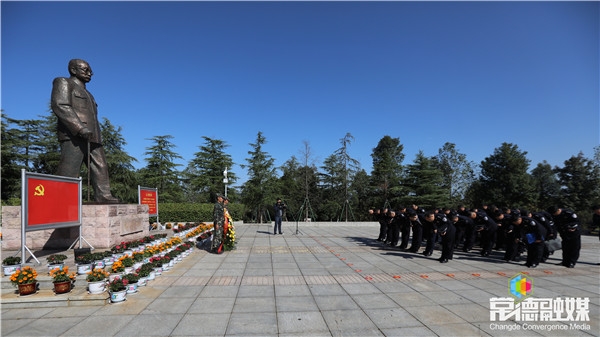 市公安局党委理论学习中心组党员干部在林伯渠铜像广场向革命先辈敬献花篮,鞠躬致敬