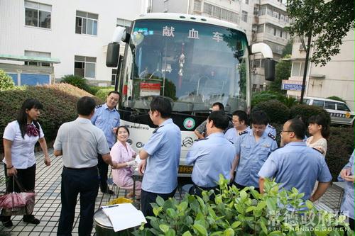 图为市工商局党组书记、局长胡祖国(左三)带领机关党员干部走上采血车