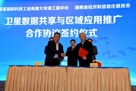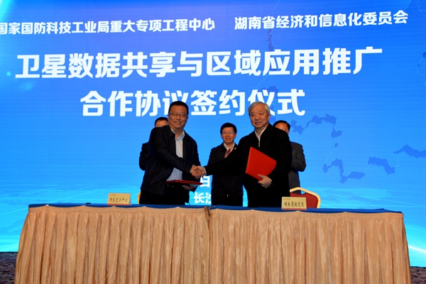 现场,国家国防科技工业局重大专项工程中心还与湖南省经信委签署《卫星数据共享与区域应用推广合作协议》。