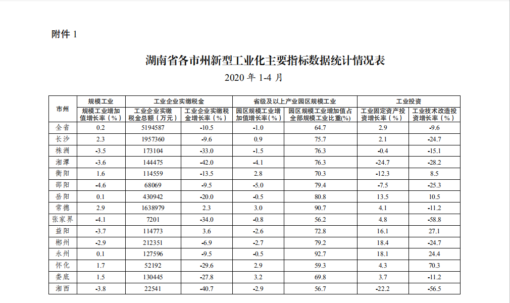 根据《湖南省新型工业化主要指标通报制度》(湘推新工办〔2014〕7号)文件精神,现将 2020 年 1-4 月全省新型工业化主要指标完成情况通报如下: