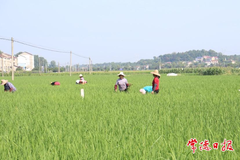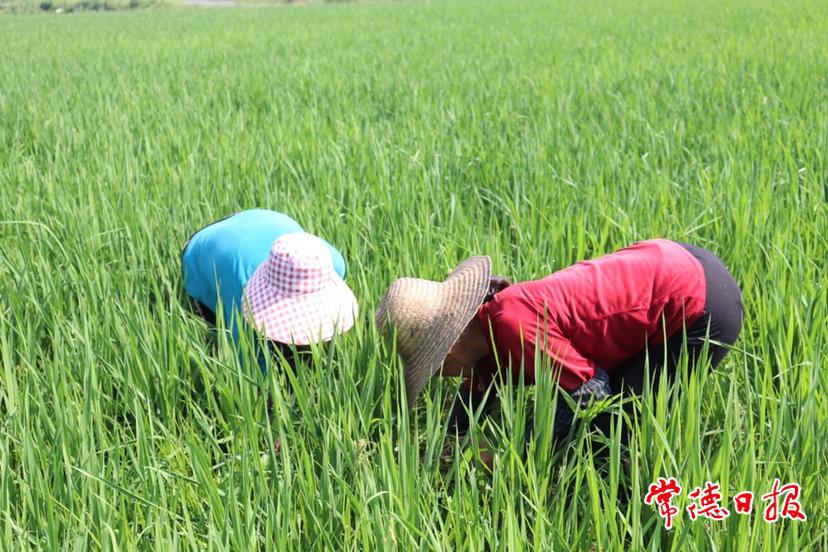 6月26日,晴空万里。桃源县陬市镇黄花桥村一片稻田里,当地农民正在水稻田里人工除草。去年9月,32岁的徐伟从深圳返乡创业,在黄花桥村流转了120亩农田,用作再生稻试验田。为了提高水稻品质,他雇请当地农民进行人工除草。在不远处的另外一片农田里,徐伟请来当地飞手操作无人机,对稻田正在进行施肥。徐伟介绍,用人工+科技的种植模式,既能确保水稻品质,又能提高作业效率。常德日报记者 葛辉文 杨鑫 摄影报道