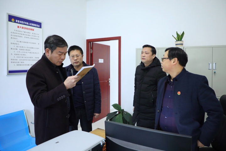 随后,王鳌一行来到市医疗纠纷调处中心,视察了中心的阵地建设、队伍建设和医疗纠纷人民调解工作开展情况,慰问了一线调解员,对他们任劳任怨、为民解难的敬业精神表示高度赞赏,对医调中心建成投入使用以来取得的成绩给予了充分肯定。