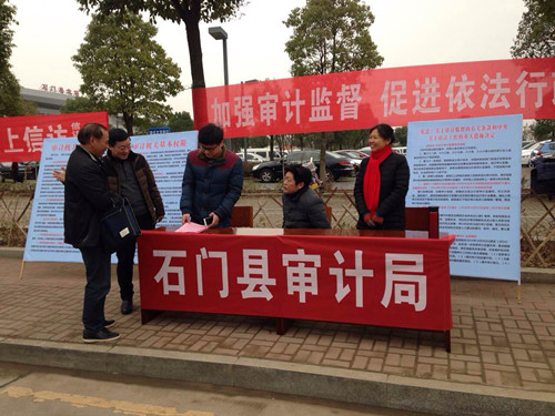 石门县审计局开展2017年春节前送法下乡活动 来源:市审计局 2017-01-23 08:34 字体:【小 大】 为切实提高人民群众法律意识,营造“尊法学法守法用法”的浓厚氛围,1月20日,石门县审计局负责人带领局属人员在石门县火车北站广场参加“送法下乡”活动,结合审计工作,开展对回家返乡人员法治宣传等送法活动。本次活动向群众发放审计知识宣传单200多张,为群众解答法律咨询问题,得到广大群众的认可,取得了良好的效果,努力让广大人民群众在浓厚的法治氛围中过上一个文明、祥和的新春佳节。(石门局 邓博文)图为审计工作人员现场宣传审计知识 相关内容