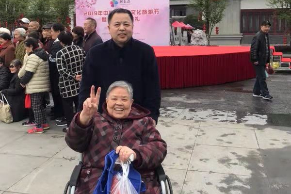 许荣武同志推着坐着轮椅的老母亲游桃花源