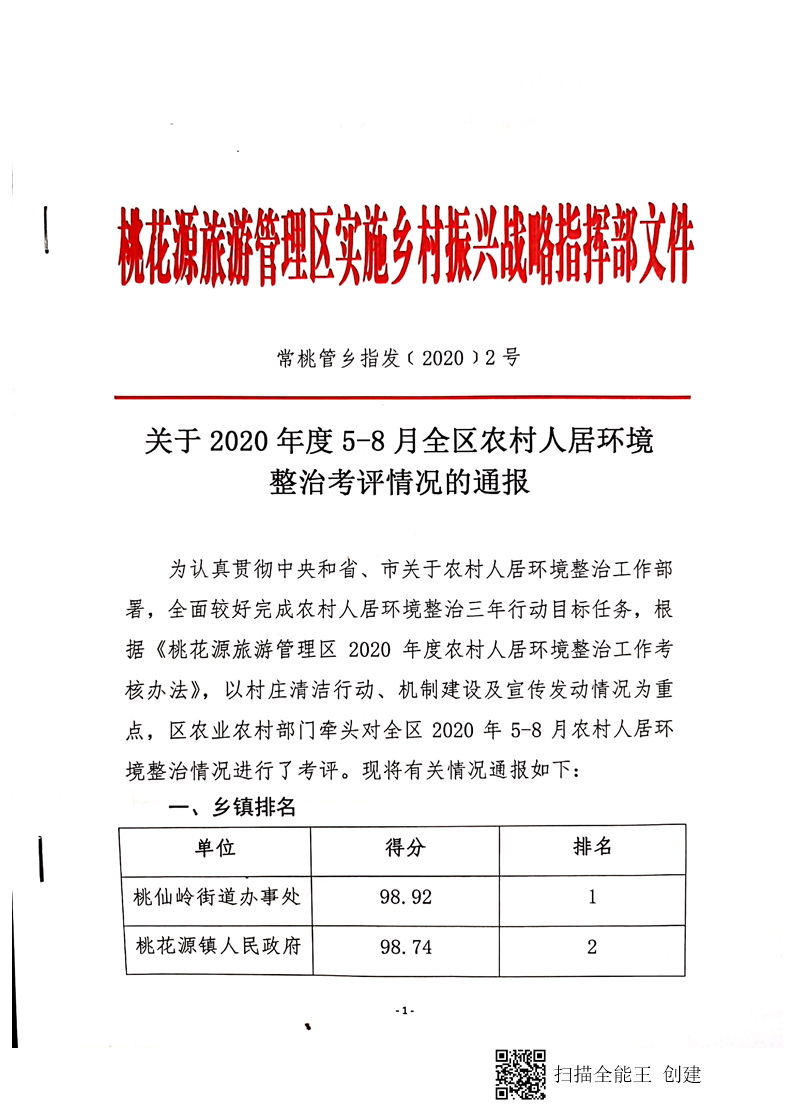 关于2020年度5-8月份全区农村人居环境整治考评情况的通报 2020-09-23 16:14 来源:桃花源旅游管理区实施乡村振兴战略指挥部 点击次数:次 分享到: 【打印】 【字体:小 大】 扫一扫在手机打开当前页