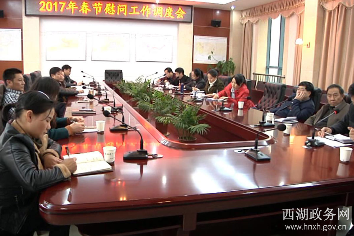 西湖政务网1月7日讯(记者 谢丽莉)为了扎实做好2017年春节慰问工作,真正让困难群众感受到党和政府以及社会各界的关怀和温暖,使他们过上一个欢乐、祥和、温馨的新春佳节,1月5日,我区召开2017年春节慰问工作调度会,会议由区党委委员、政法委书记熊永忠主持,区党委副书记、管委会副主任周一夫出席会议。