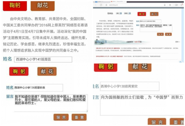 西湖政务网4月8日讯(通讯员 郑敏)缅怀革命先烈,继承优良传统,弘扬绿色文明祭奠新风。在清明节期间,西湖中心小学组织指导全体师生参加了由中央文明办等中央国家部门共同举办的“2016清明网上祭英烈”大型网上签名寄语公祭活动。各班班主任利用班级微信群,建议家长带着孩子于4月1日—7日期间,在中央文明网、常德文明网上,用鼠标向烈士鞠躬、献花,表达对英烈的哀思,并在留言栏里撰写寄语体会,表达对革命先烈们的诚挚的敬意和深切的怀念。