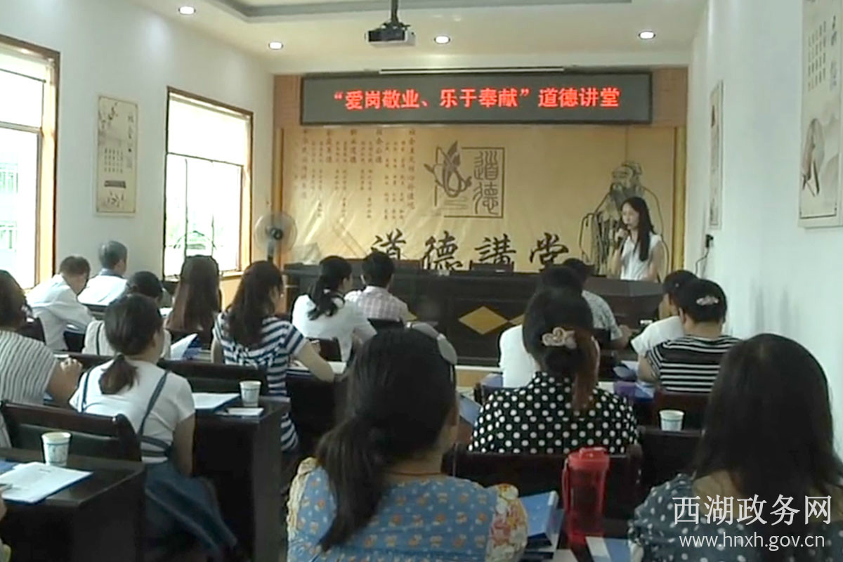 本次道德讲堂重点突出“爱岗敬业,乐于奉献”这一主题,分为“唱歌曲、看短片、讲故事、做反省、诵经典、送吉祥、作点评等7个环节进行。在主持人的带领下,全体干部职工伴着音乐共同高唱《爱的奉献》;观看了全国爱岗敬业道德模范贾立群“爱岗敬业,乐于奉献”的感人事迹;倾听了西湖区人民医院内儿科主任邓欣星在工作中朴实而感人的故事。让大家经历了一次心灵的洗涤,深深感受到了道德榜样的力量。闭上双眼认真反省感悟,接受道德的洗礼;诵读了传统经典《周易》的经典语句;为干部职工送上吉祥物,鼓励干部职工在工作中爱岗敬业,无私奉献,照亮自己的同时也给别人带来光明和希望,感受到了身边人爱岗敬业的崇高品德,他们尽心尽责,默默奉献,在平凡的岗位上书写着不平凡的事迹,用平凡的人生诠释着不平凡的坚持。