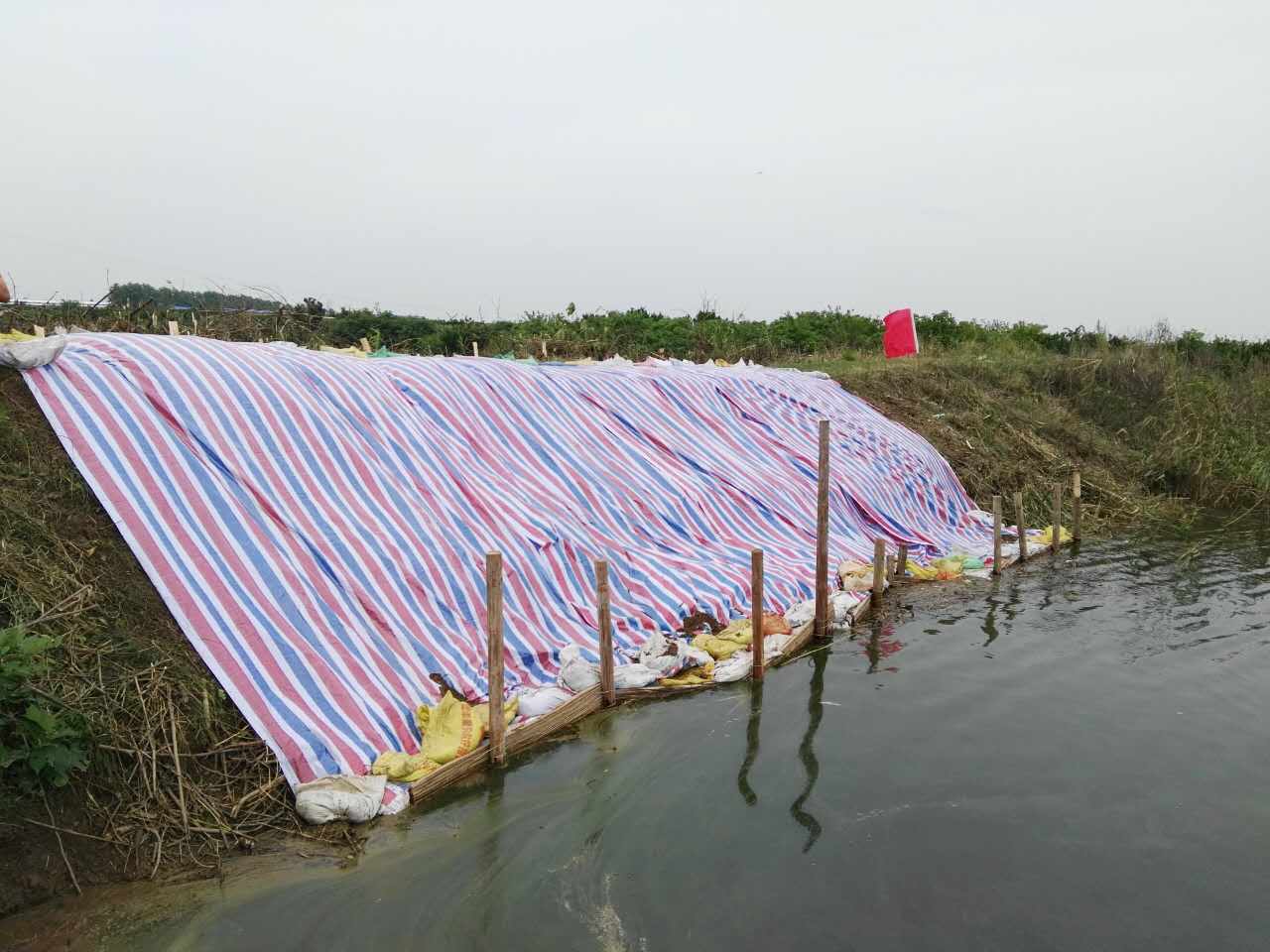 整个险情处置在区、乡防指的指挥下有条不紊地展开,抢险队员们首先在滑坡一面利用植桩机打入十余根木桩,然后用竹桥连接相邻的木桩,形成一面拦阻墙,再往拦阻墙和河堤之间投入300余袋袋装泥土,加固堤身,最后对滑坡区域用彩条布全部覆盖,防止裸露的堤身受雨水冲刷,避免险情扩大。整个险情的处置共出动抢险队员二十余人,历时六个小时。