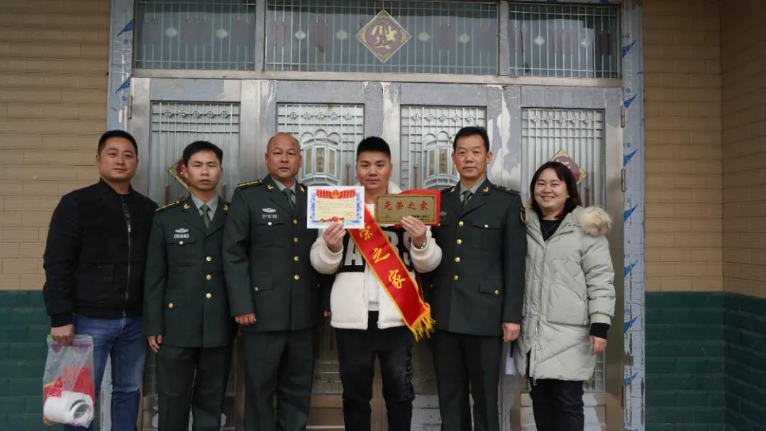 “一人入伍,全家光荣,老刘同志,祝贺啊!”区武装部副部长谭勇军握紧着军属的手说道。随之为军属佩戴好绥带,庄重地递上新兵入伍通知书,将印有“光荣之家”的光荣牌悬挂在其家门口。