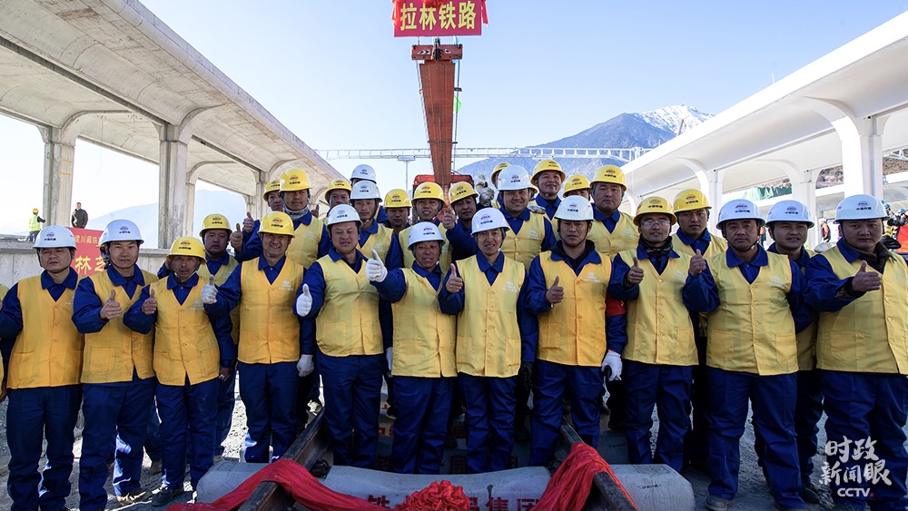 △2020年12月31日,西藏林芝,中铁十一局施工人员庆祝川藏铁路拉萨至林芝段轨道全线铺通。
