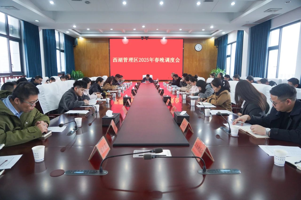 会议宣读了西湖管理区2025年春节联欢晚会筹备方案,并就相关部门职责和任务进行了分解。各小组负责人就宣传片制作、演出节目类型等问题进行了深入交流。