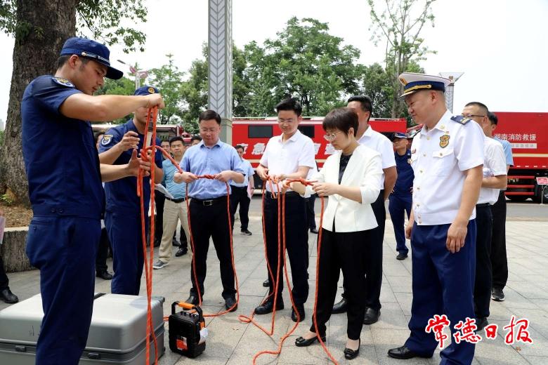 市委常委、常务副市长徐永健(右二)带队巡视水域救援装备及消防员技能操法展示。