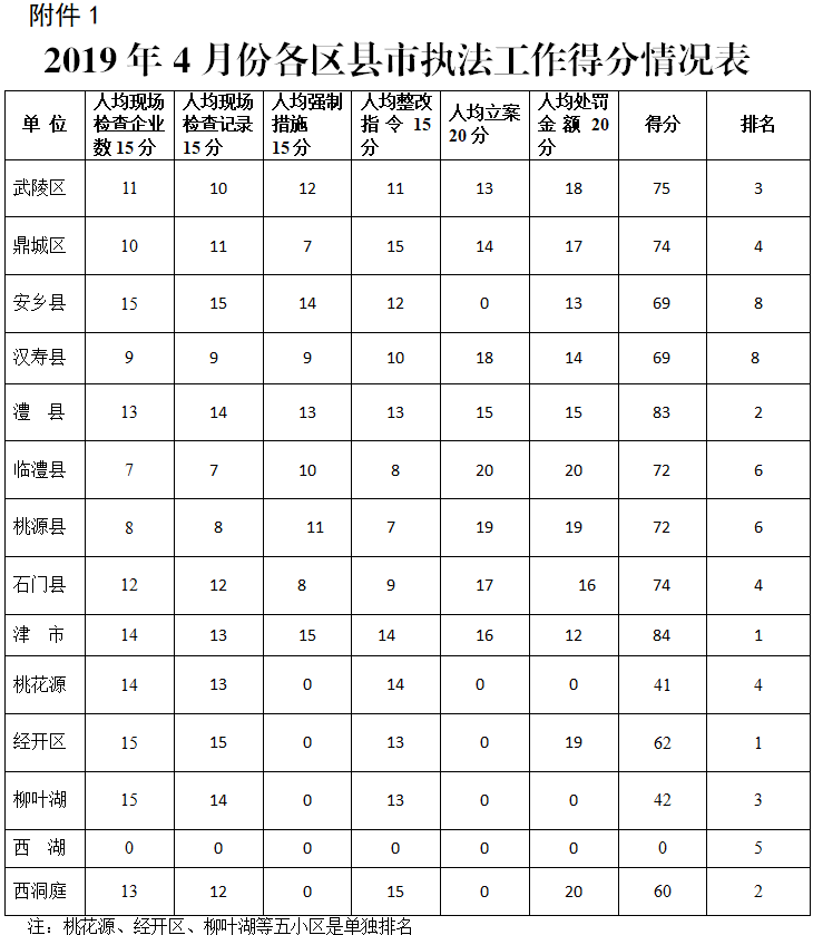 为认真贯彻落实省安委会和省应急管理厅关于继续推进安全监管“强执法防事故”行动的部署要求,持续推动全市安全生产“强执法防事故”行动,市局依据湖南省安全生产行政执法管理系统录入的数据,按照《“强执法防事故”执法工作考核细则》对各区县市4月份安全生产行政执法工作进行了考评。现将有关情况通报如下: