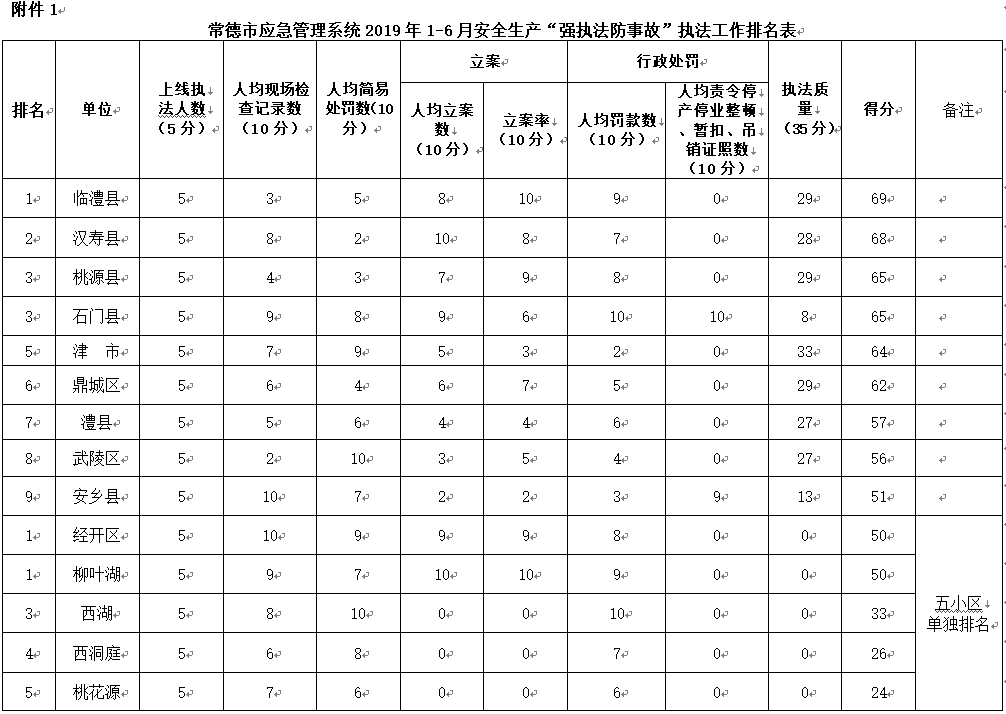 附件:1.常德市应急管理系统2019年1-6月安全生产“强执法防事故”执法工作排名表