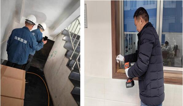 据介绍,县委大院是安乡县历史建筑,房屋年代久远,且大多为木质结构,县委办、党史办等办公楼白蚁危害日益严重。经过白蚁防治技术人员对县委大院白蚁危害进行全面的现场勘查,发现整个院落大部分绿化带都遭受了不同程度的白蚁危害,院落樟树、杉树、红花檵木等危害较为严重,从危害迹象技术人员判定危害白蚁种类主要是散白蚁。县委办公楼的大门、门框、窗户、楼梯口等都遭受了白蚁不同程度的啃食,尤其是门框,被白蚁危害的已经不能继续使用。鉴于治理散白蚁的复杂性和对房屋危害的严重性,考虑到机关大院是办公密集的场所,不能随便使用药剂进行白蚁治理,经过技术人员全方位综合考虑,在室内根据危害程度不同采取了不同的治理方式,木制门框、窗框采取了“钻孔设饵”法,木制踢脚线采取均匀多点喷洒粉剂的方式进行了防治处理,达到灭治白蚁的效果。室外的绿化带采取全面药物喷洒的方式进行治理。同时,技术人员现场传授了房屋建筑的白蚁防治新技术、新方法,解读了白蚁防治新政策、新规程。