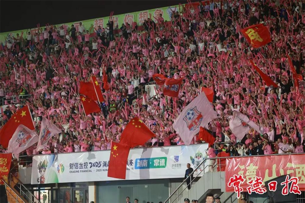 绿茵终有界,山水常相期。今夜,吾愿以桃花为笺,沅澧着墨,感谢你,张家兄弟!我们从来就是山水相依、骨肉相连一家人。赛场之上,君如澧水奔涌,攻势似武陵奇峰迭起,锋线凌厉如金鞭溪穿云裂石;我亦借沅江之势,守若壶瓶山稳立,传控若诗墙绵延不绝。赛场之上,黄衣少年与粉色闪电激烈拼抢,每一次攻防交锋皆成画卷。最难忘,那一位潇洒帅气的守门员堪称英勇顽强。今夜,我们一起用汗水诠释了坚韧,用拼搏点燃了激情,尽显湖湘男儿英雄本色!感谢你,亲爱的张家界球迷们!你们跨越山水而来,用震天的呐喊为球队注入灵魂,用文明的观赛展现“国际张”风度。看台上那片跃动的火焰,是今夜最美丽的风景。