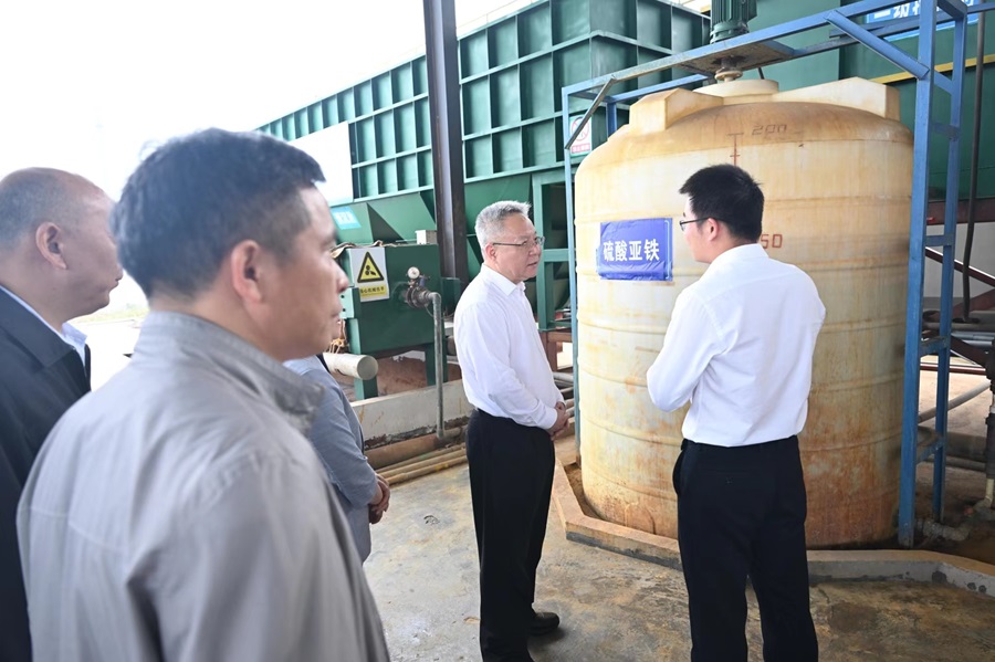 5月10日,沈晓明在长沙铬盐厂察看一体化污水处理设施,听取历史遗留废渣环境污染问题整改情况介绍。
