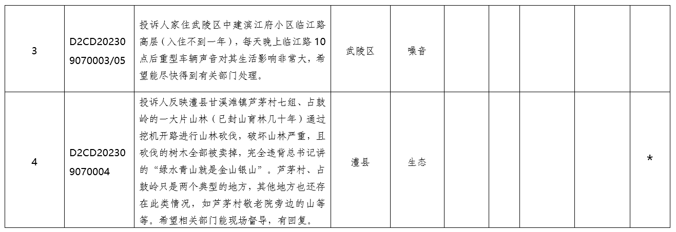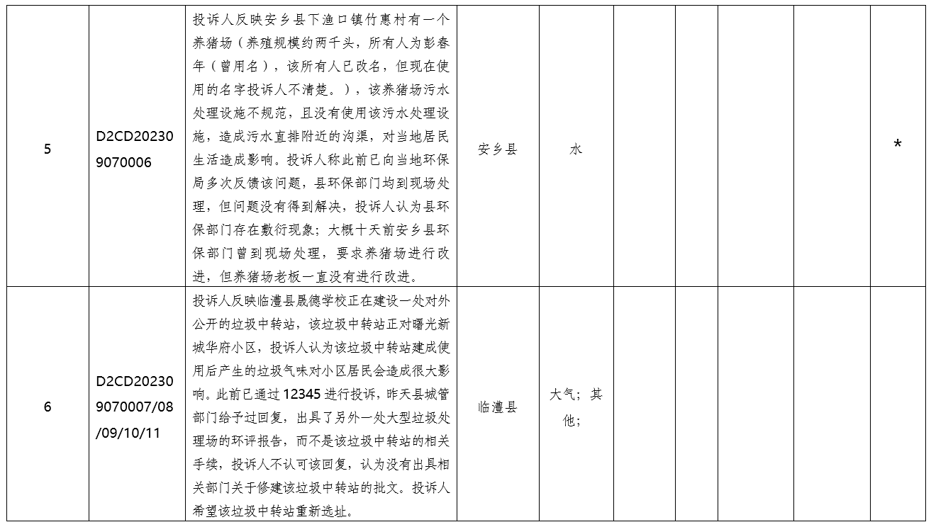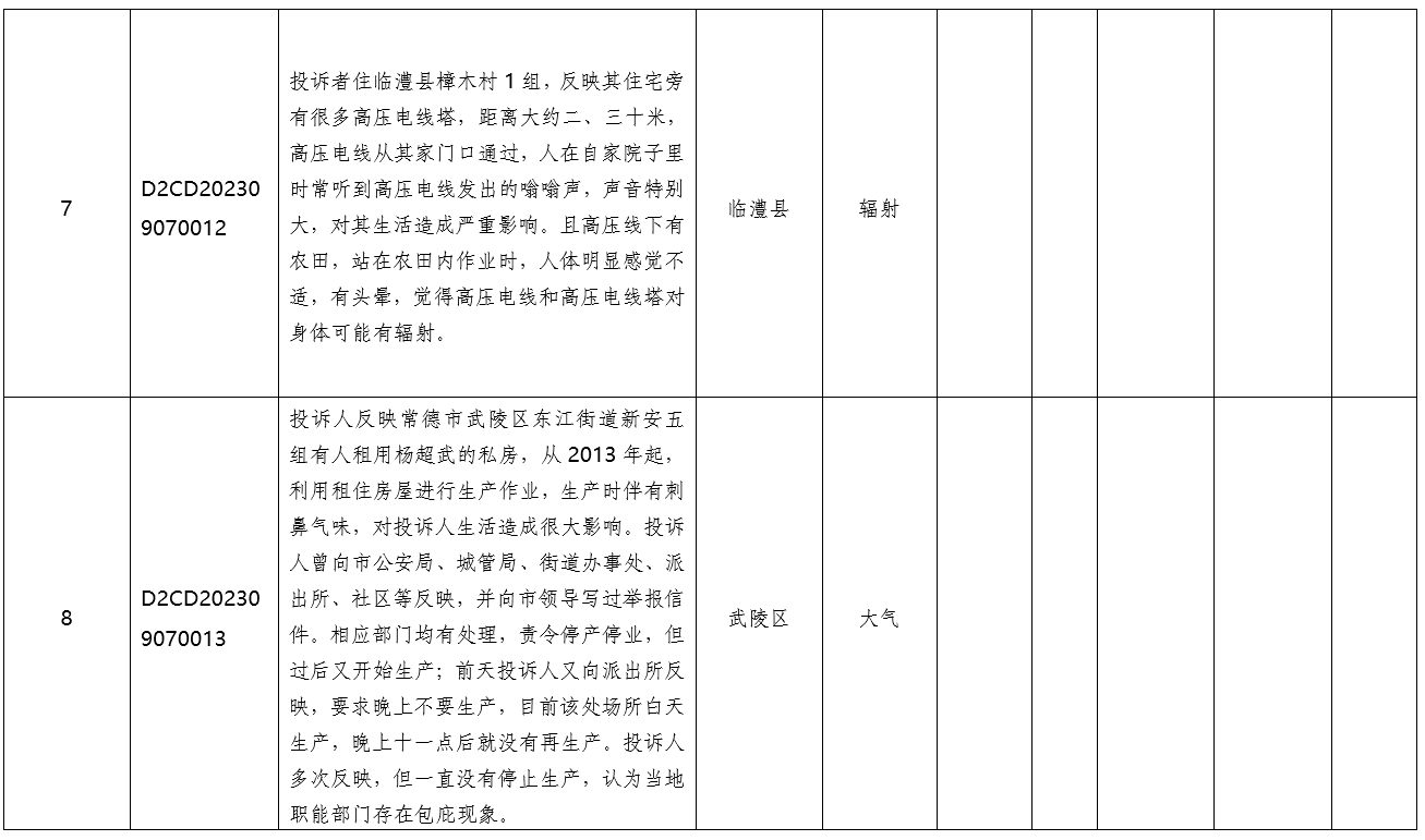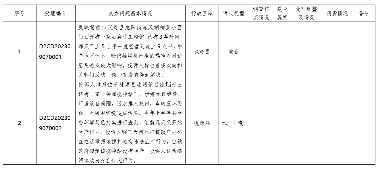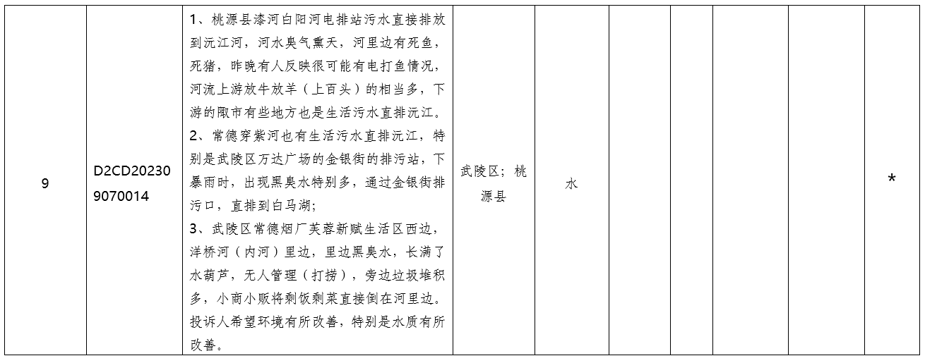 9月7日08:00至20:00,督察组接群众生态环境保护方面信访举报14件,经整理合并同一投诉件后转办我市9件(含重点件3件)。其中:涉及武陵区2件、桃源县1件、汉寿县1件、临澧县2件、澧县1件、安乡县1件、武陵区和桃源县、市住建局合办1件;污染类型:噪音污染2件,大气污染2件,水污染3件,生态破坏1件,电子辐射1件。已按要求交由相关县市区办理,现将群众信访举报转办和边督边改公开情况予以公开(详见下表)。